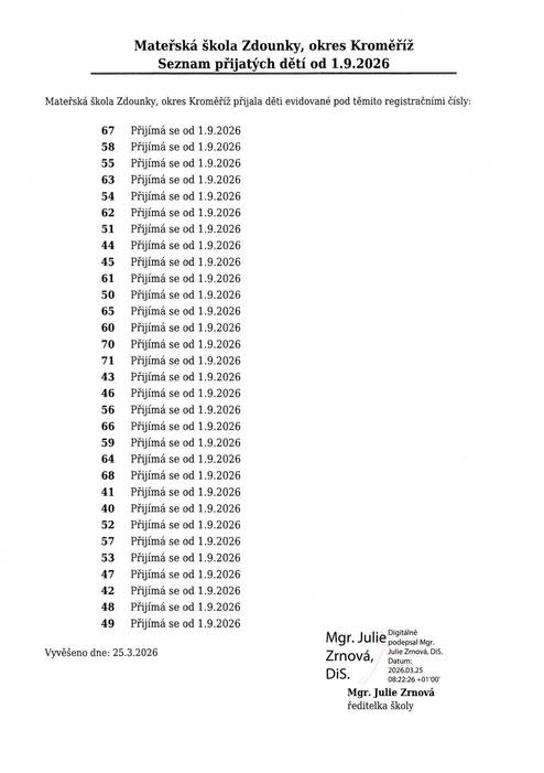 Výsledky zápisu do předškolního vzdělávání pro školní rok 2026/27.